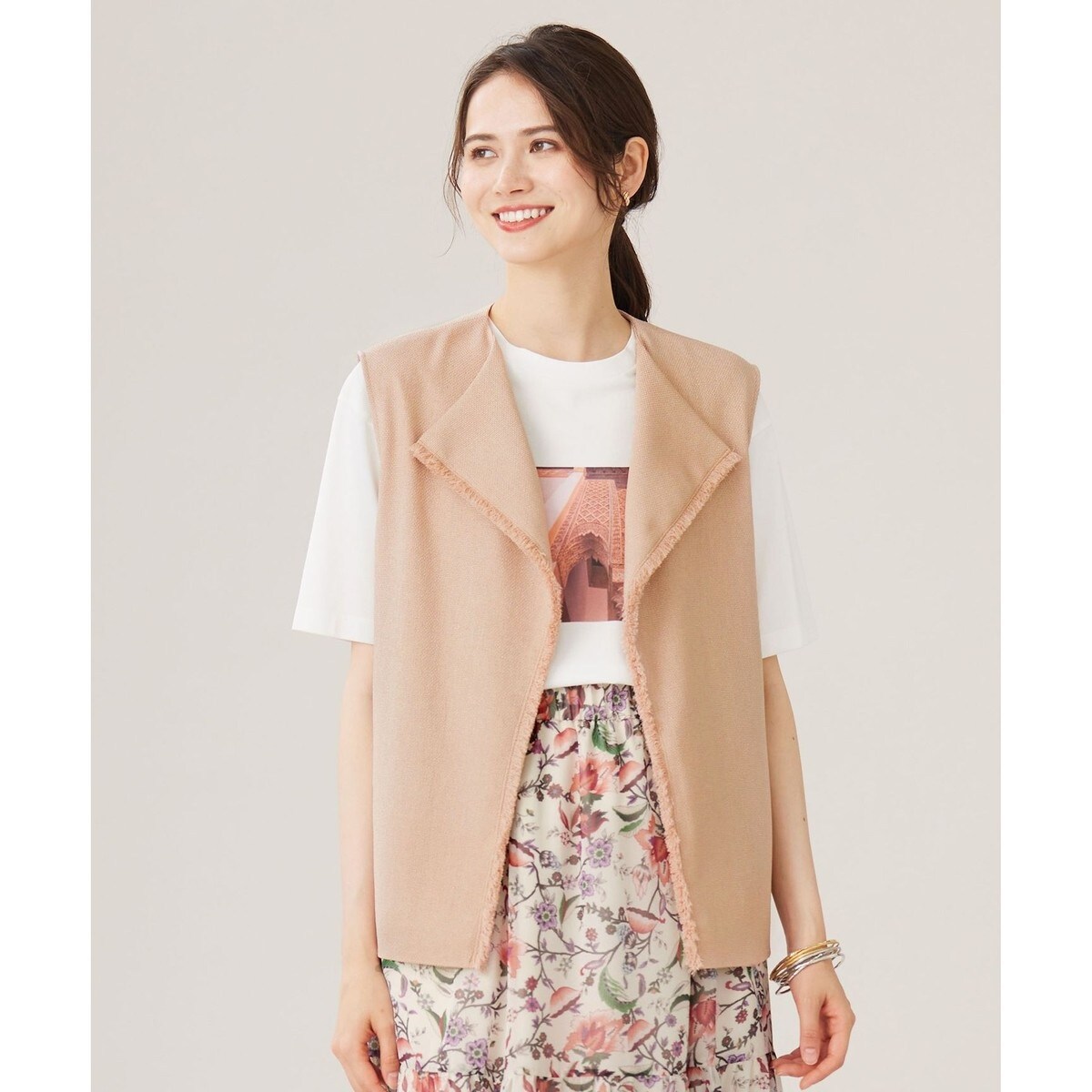 リッチな表情の素材でコーディネートが華やぐデザインジレ■デザインボリュームのあるフリンジと大きく返る襟がお顔周りを華やかに見せてくれるジレです。立体感のあるリッチな表情の素材なので、シンプルなトップスにレイヤードするだけでコーディネートを格上げしてくれます。長すぎず、短すぎない絶妙なレングスで気になる腰周りをカバーしつつ、ワイドパンツやスカートとも合わせやすいバランスです。同素材のスカート(SKWMCA0101)とセットアップでのコーディネートもおすすめです。■素材ざっくりとした表面感が特徴の麻調合繊素材です。奥行きのある表情と、見た目よりも軽く程よいストレッチ性を実現しました。シワになりにくく、接触冷感、UVカットも嬉しいポイントです。■同素材アイテムスカート(SKWMCA0101)