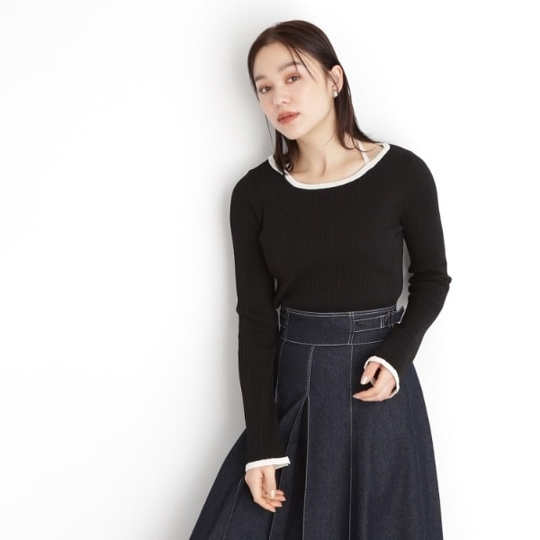 リブニット素材のこのトップスは、配色の衿ぐりがポイントで、衿ぐりの紐はホルターネックやチョーカー風にアレンジ可能。