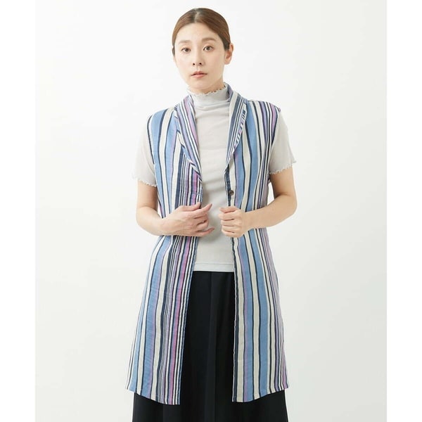 多色のストライプ柄は、カジュアルに振り切らないよう、小さめのショールカラーデザインにし、きちんと感のあるロングジレに仕上げました。ウエストサイドに共地のリボンがついており、お好みで取り外し可能です。