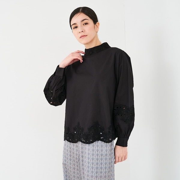 スタントカラーの首元にはレースを重ね、レイヤードした際にもポイントになります。