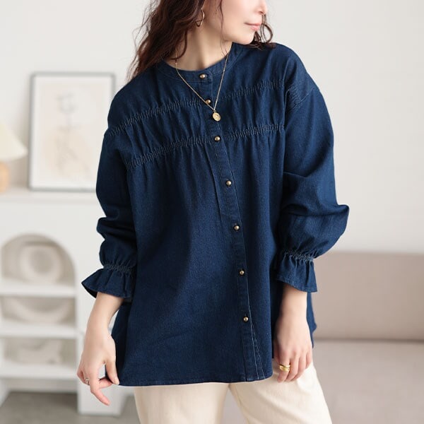 ラクして可愛い、拘りあるアクセントが光るデニムトップスは、胸元あたりに配されたギャザーデザインに、キャンディースリーブがガーリッシュさを演出。ころんとしたゴールドボタンが上品さを重ね、大人っぽさ漂う雰囲気に。ノーカラーだからお顔周りもすっきり。ハイネックのインナーとも好相性です。カジュアルの王道であるデニムアイテムは、廃りの無いトレンド感を演出してくれる一枚。ゆったりとした着心地でリラクシーさがありながら、絶妙丈ですっきりと。隠したいポイントはさり気なく隠してくれる、ラクしてお洒落を楽しめるデニムシャツです。