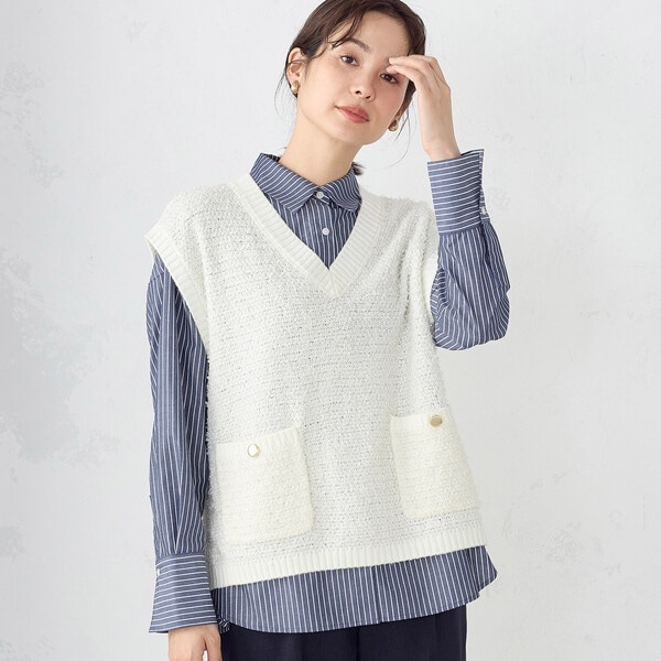ツイード調に仕上げたリボンヤーンのニットベスト(2色)上品レイヤードを叶えてくれます。