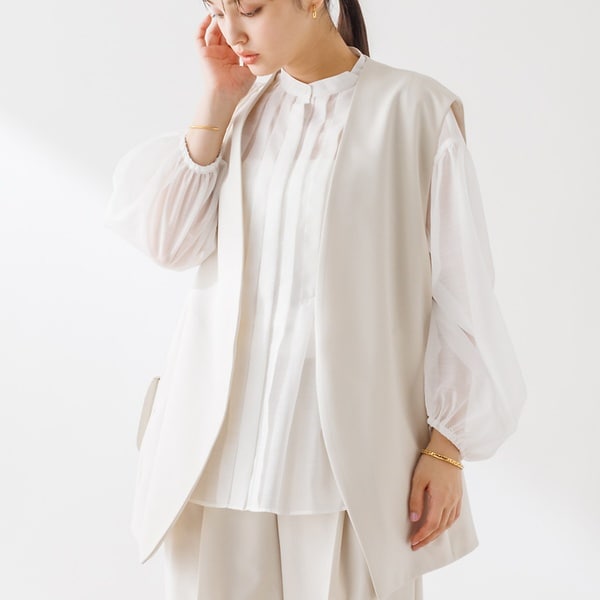 程よく張りのあるポリエステルの素材を使ったジレ。
