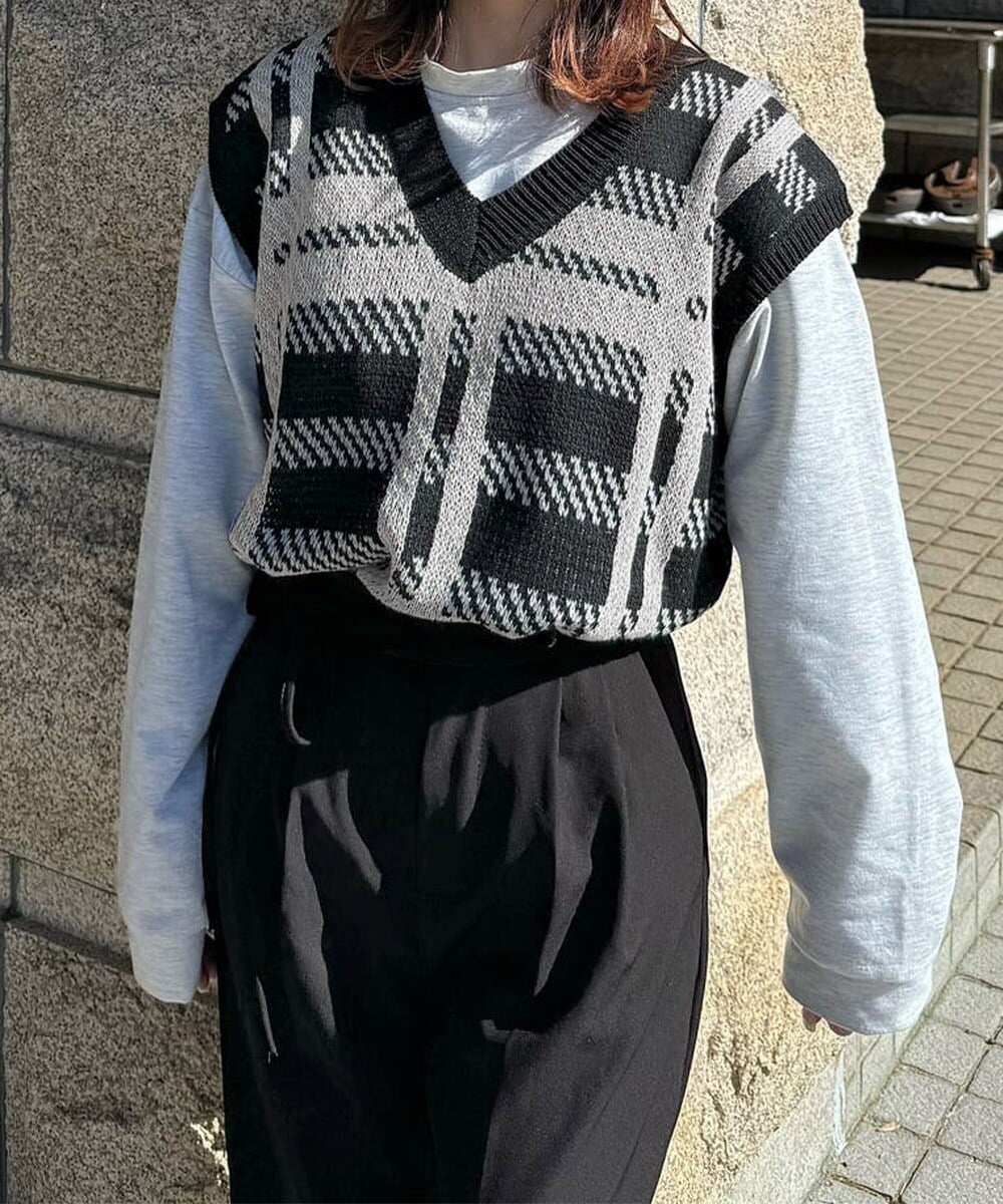 ニットベストはロンTやシャツ、ブラウスとのレイヤードはもちろんワンピースとのレイヤードもオススメ