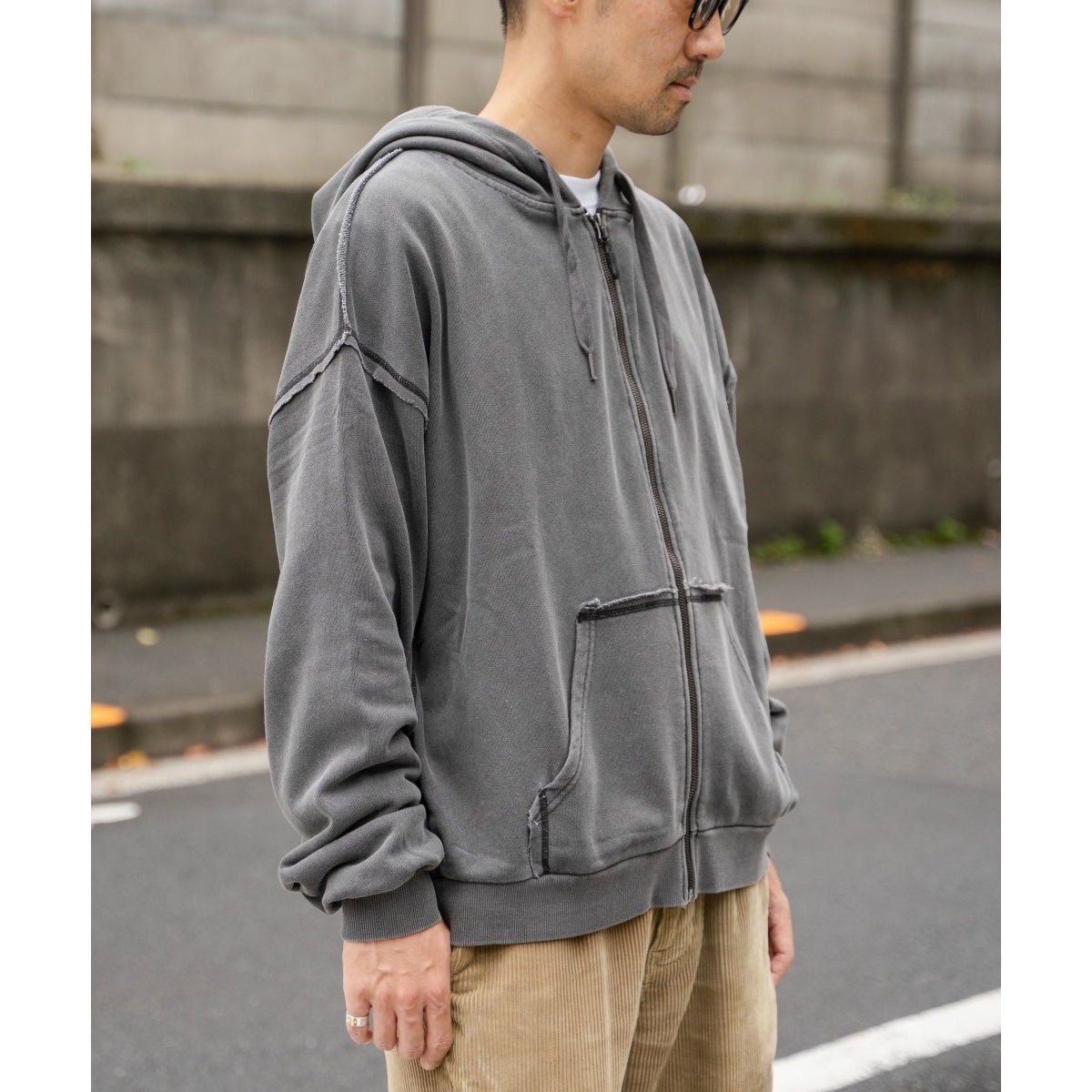 着込んだような色落ち感、フェード感を表現したピグメント加工のジップパーカー。