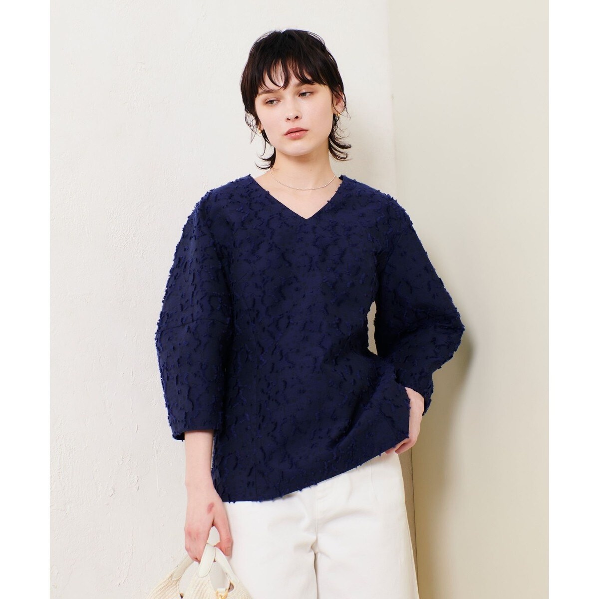 ウエストをシェイプした体から離れたラインと丈感が新しいバランスのブラウスです。