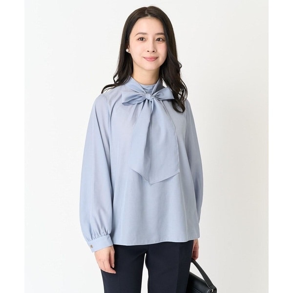 ジャケットの羽織りにちょうど良く決まるやや高めのスタンドカラーブラウス。大きめのふんわりとしたボウタイが今年らしい印象で、リボン結びできれいに決まる長さに仕立てています。ネック後ろにボウタイを通すループが付いているのでずれる心配もなく、またボウタイ無しで着用しても気になりにくい仕様です。