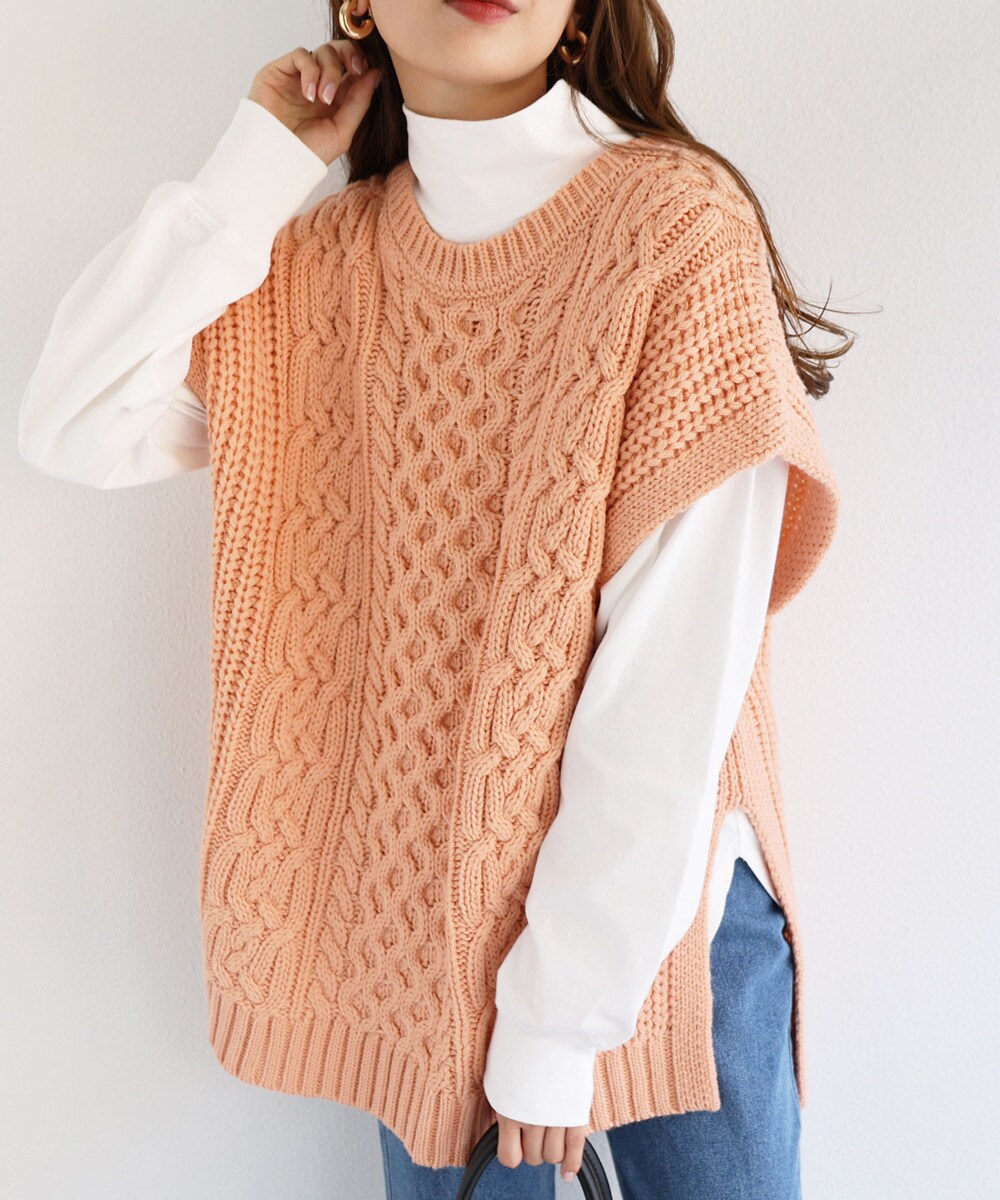 【まとめ買い対象】ケーブル編みフリンジベスト【ニット】