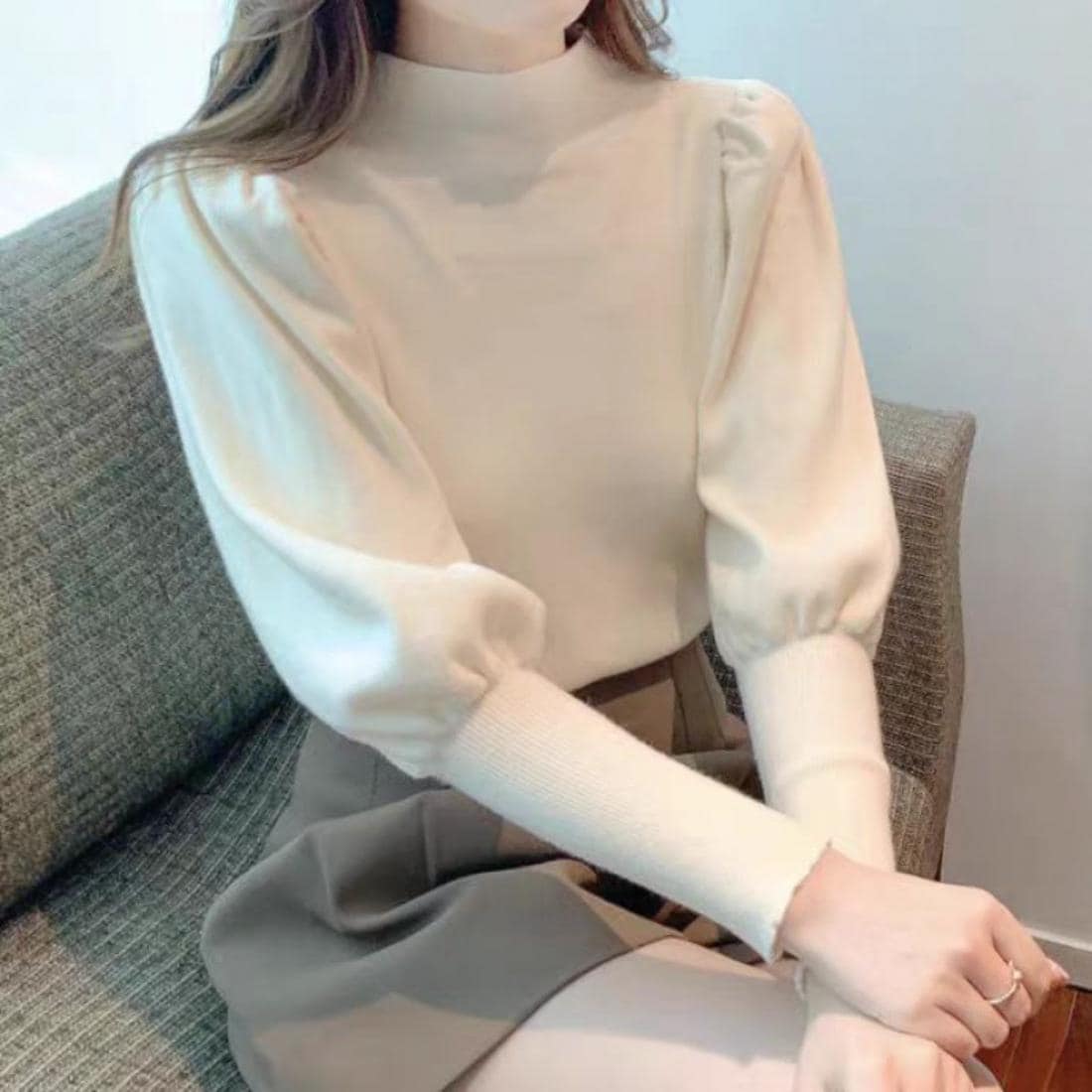 ボリュームのあるパフスリーブが二の腕をしっかりカバーしてくれ、華奢見え効果あり。<br>