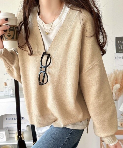 モード Vネック編み柄ニット シンプル 大人カジュアル ミニマル