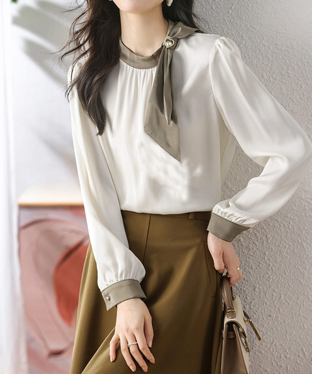 滑らかな生地で触り心地も良く、ポイントのボウタイと袖口のバイカラー配色が洗練された雰囲気を演出