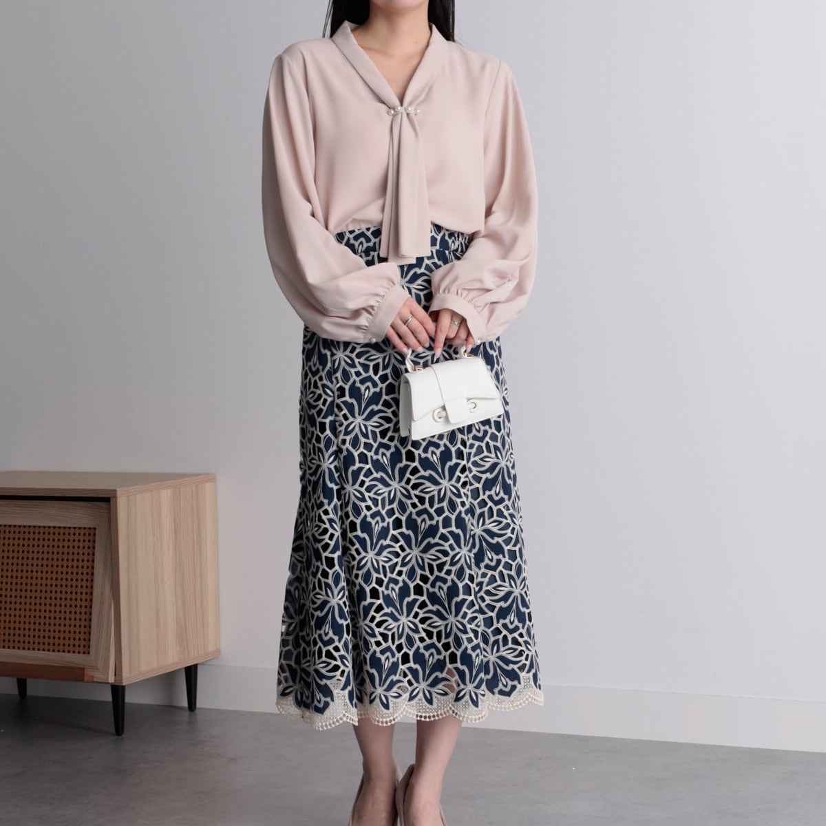 ・衿元のボウタイ衿が上品な印象。