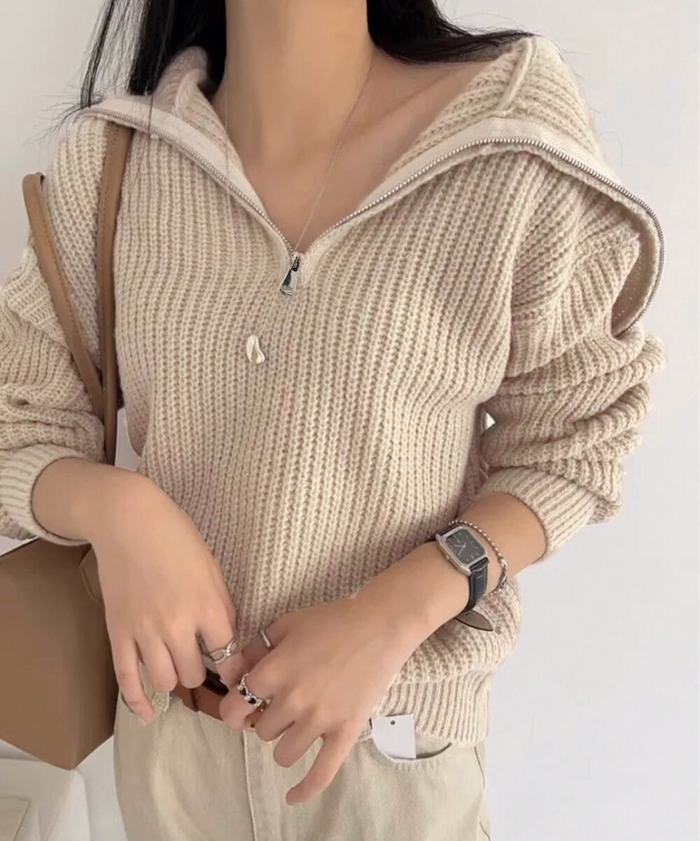 大人カジュアルな旬顔ハーフジップニットプルオーバー。