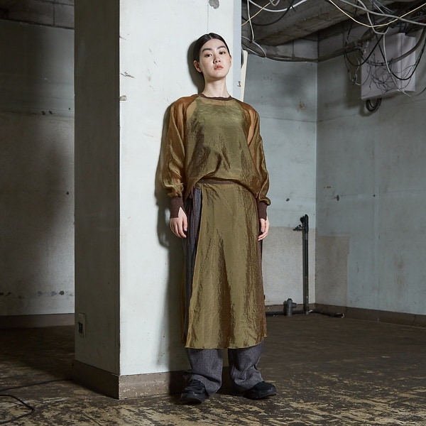 シャンブレー感のある絶妙な色味とシアー素材が目を引くシャツプルオーバーとスカート。