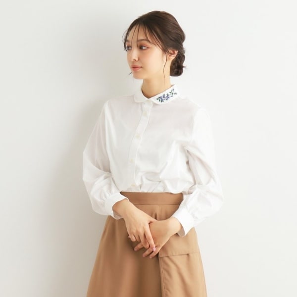 ライン状の柄から抜き出したモチーフを使用した、かわいらしい印象のラウンドカラーシャツ。