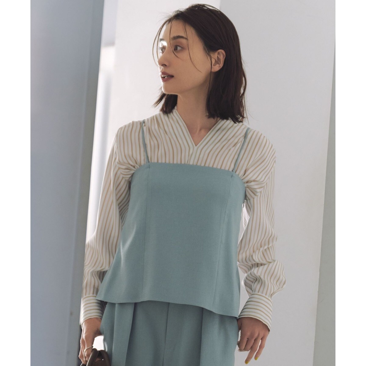 トレンドのレイヤードスタイルに取り入れたいキャミビスチェ■デザイントレンドのキャミビスチェです。大人でもさり気ない着こなしができるように、シンプルで体のラインを拾いにくいストレートシルエットに仕上げました。前見返しには滑り止め防止のテープをたたきつけ、体に程よくフィットするように後ろはゴムを入れています。ストラップは取り外しと長さ調整が可能です。ブラウスやカットソーとのレイヤードスタイルに取り入れたいアイテムです。同素材のジャケットやパンツと合わせてセットアップで着て頂くのもおすすめです。■素材麻見えを意識して作られた合成繊維素材です。スラブ調の糸を使用して表面に凹凸感を出し、よりナチュラルな天然素材の表情を実現しています。ストレッチ入りで着心地が良く、さらりとしたタッチと軽さ、通気性が特徴です。シワが目立ちにくく、キレイ見えし、接触冷感機能付きなのもポイントです。■同素材アイテムテーラードジャケット(JKWMGM0302)ワイドストレートパンツ(PRWMGM0302)キュロットパンツ(PRWMGM0303)