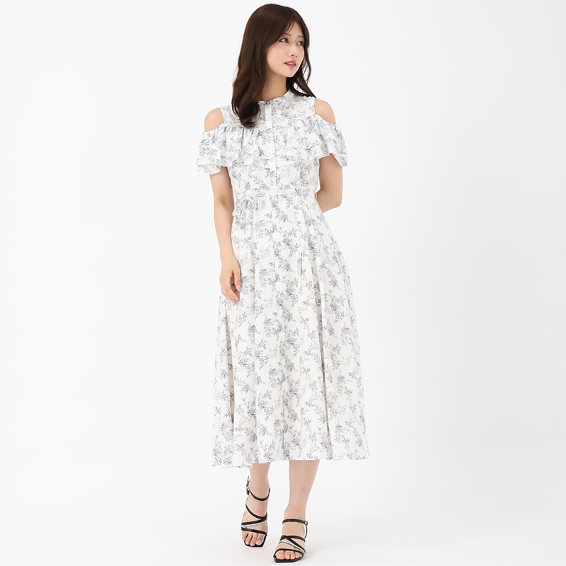 2段のラッフルフリルが華やかな肩開きラッフルフレアワンピースです。肩にある釦を閉じると肌見せを抑えることができ、シーンや気分に合わせて2wayに着こなせるデザインです。ウエストから裾にかけて揺れ感がキレイなAラインシルエットがフェミニンさを演出。スカート部分のみ裏地付きの仕様です。