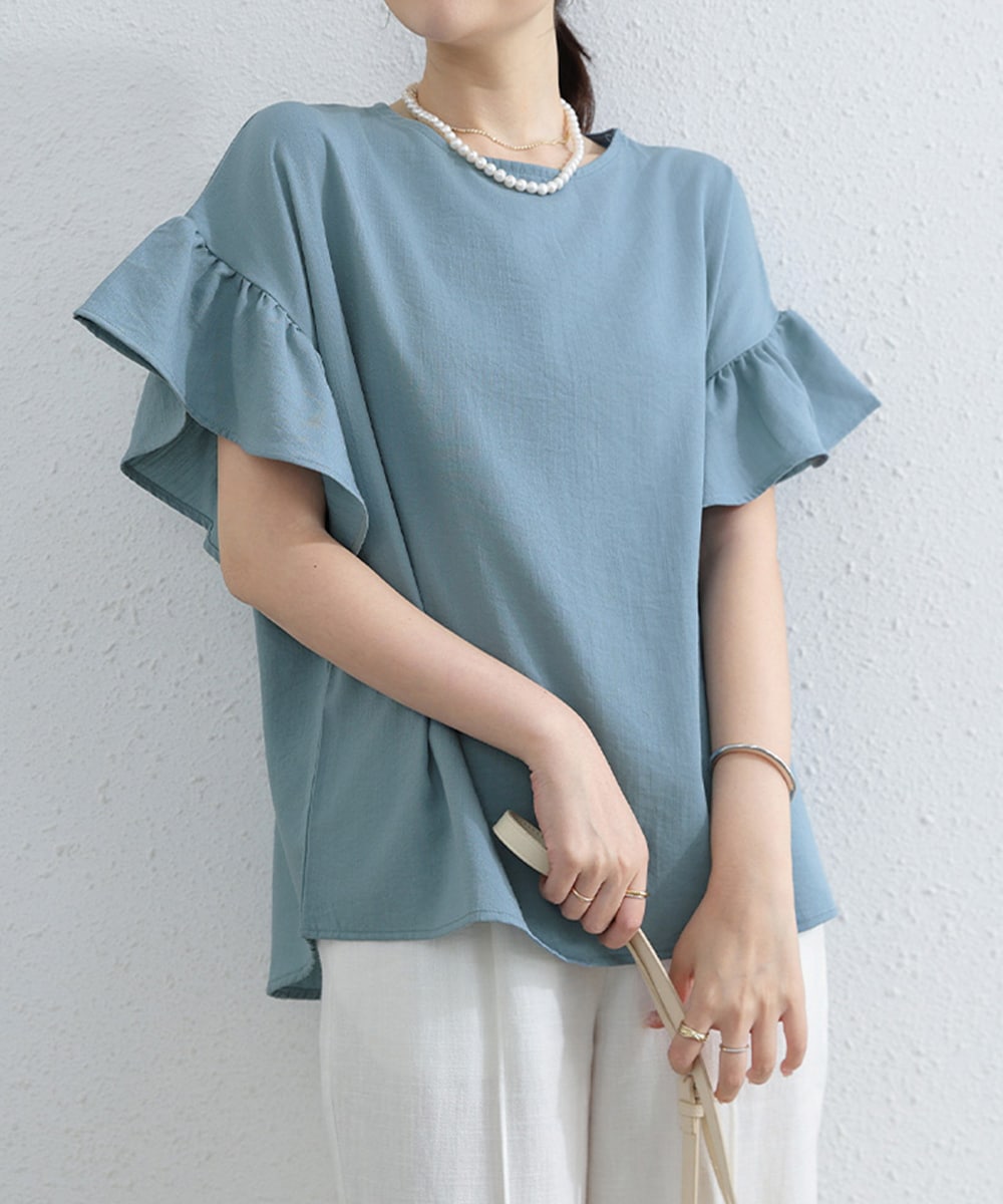 風通しのよいフリルスリーブ、夏の一枚着に最適のカットソー