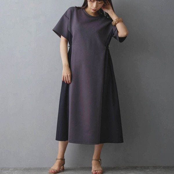 脇から背面部分を布帛に、ウエストをドロストデザインにしてすっきり見えシルエットが叶う一枚に。