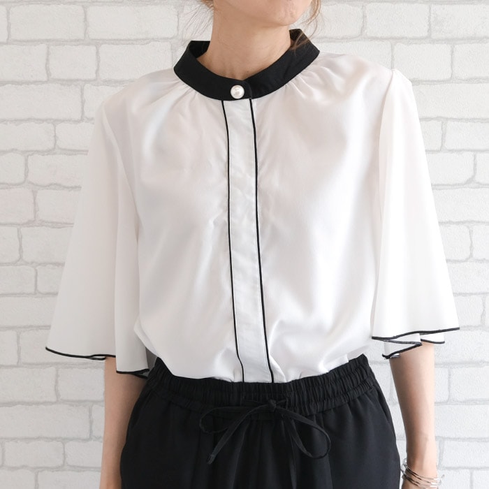 パール釦ポイントバイカラーフレア5分袖ブラウス