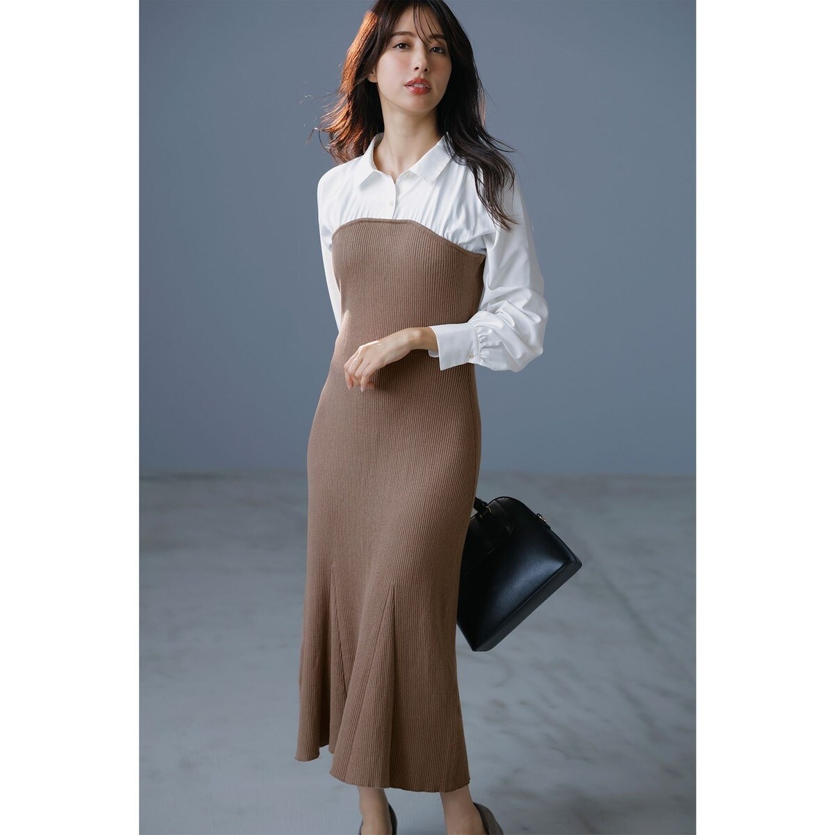 ニットワンピースにシャツをドッキングしたレイヤード風コンビワンピース。上品な襟付きできちんと好印象を狙えます。ボディのニットはウエストをすっきりと、スカート部分はマーメイドラインでメリハリのある女性らしいシルエットに。リブ編みのニットを使用しているため程よい厚みがあり、下着やインナーラインの透けも気になりにくくなっています。