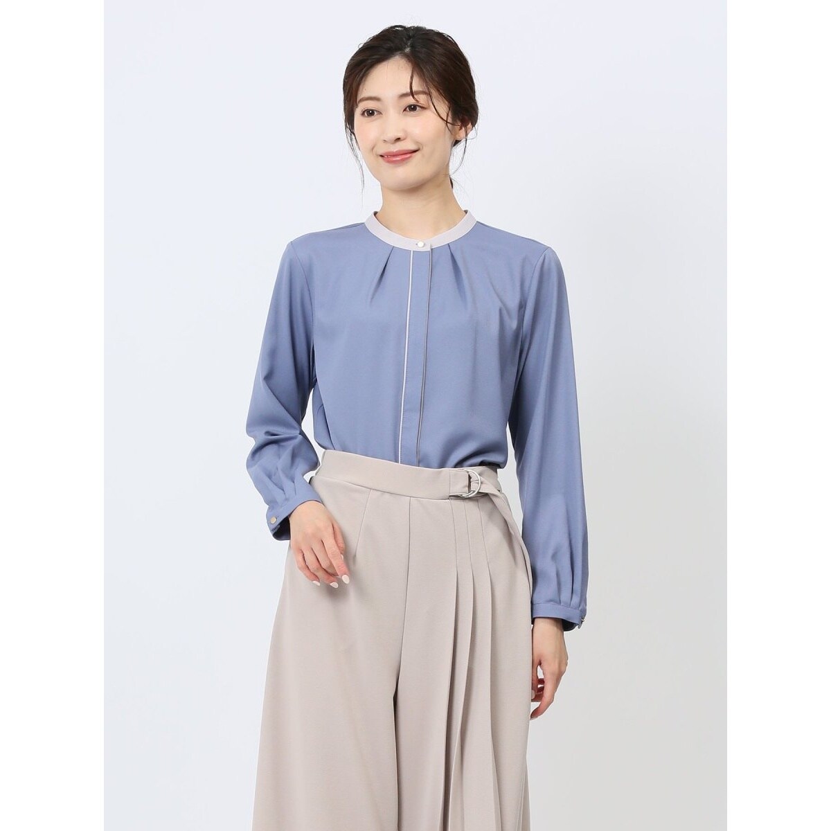 【ストレッチ イージーケア UVカット】m.f.エディトリアル バンドカラー配色 比翼 長袖ブラウス