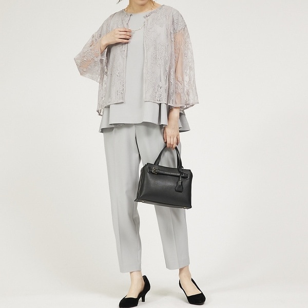 今まで同素材のみで展開していた本シリーズに、色合わせで使えるレースボレロが登場しました。こちらはそのボレロと、定番人気のフレンチスリーブブラウスとパンツのセットアップとの3点セット。フレンチスリーブブラウスに合わせてデザインされたボレロなので、しっかりフォーマルな印象に。よりドレッシーで女性らしく、暑い季節も涼しく着用していただけます。