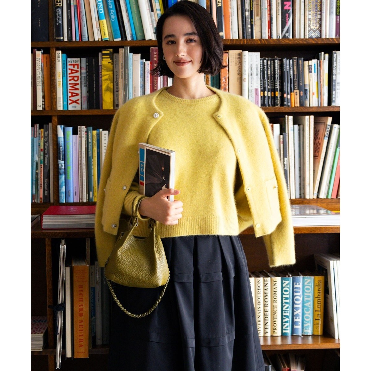 ■デザイン軽くて保温性に優れたヘアリーなニットは1枚で着映えする袖のタックディテールや長めのリブ袖がポイント。スカートや分量のあるボトムに合わせたときに丁度良い丈感ですっきりと決まります。肩の位置をやや内側にすることで女性らしい華奢なシルエットに仕上げ、楽な着心地ながら上品に決まるデザインを追求しました。同素材のニットジャケットとのアンサンブル着用もおすすめです。