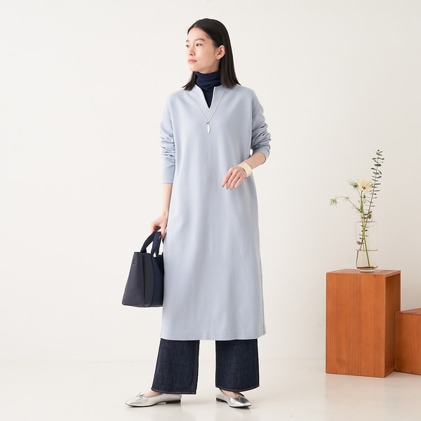 首元はキーネックになっており、すっきりしたニュアンスのある着こなしに。