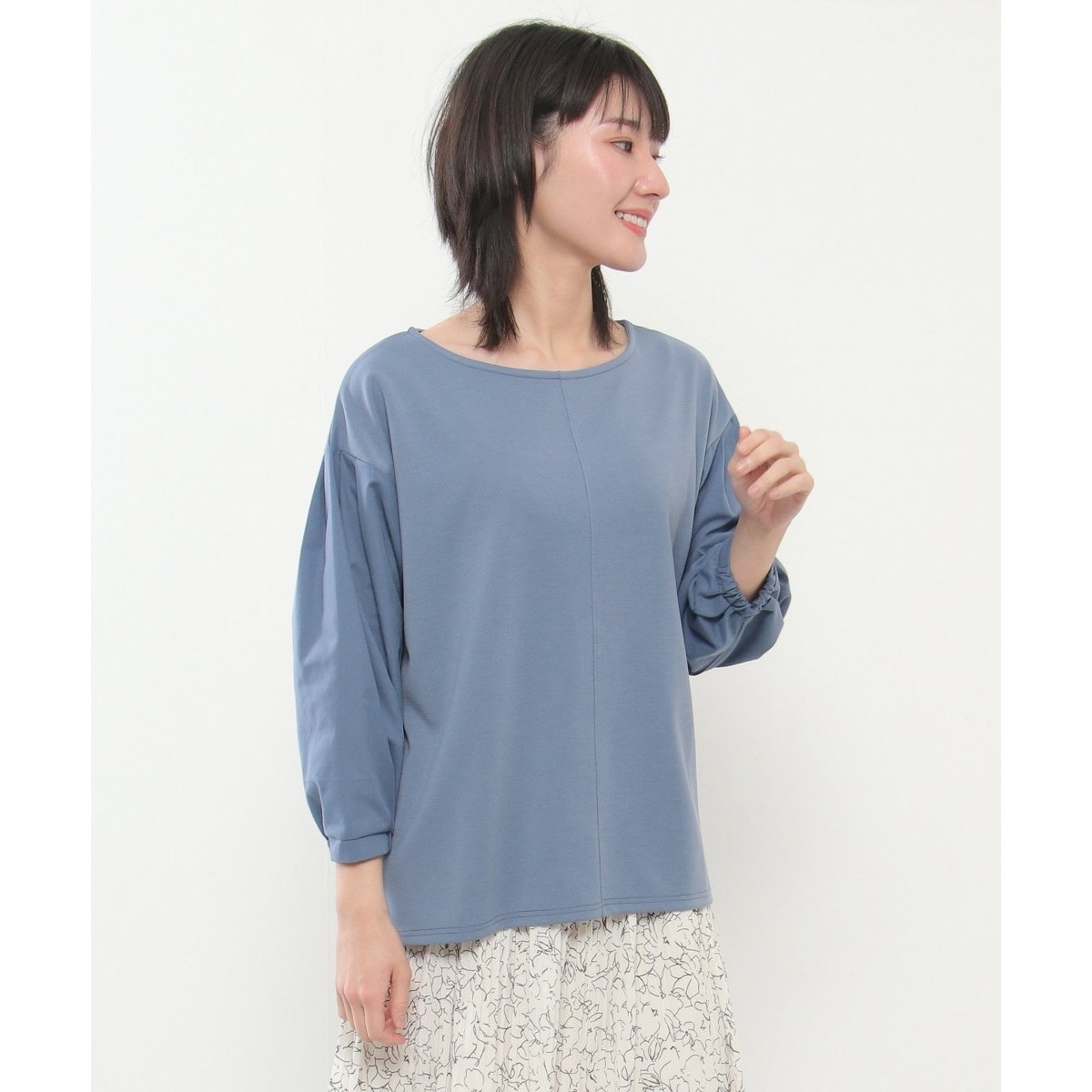 身頃と袖の素材感の違いをデザインポイントにしたカットソー。
