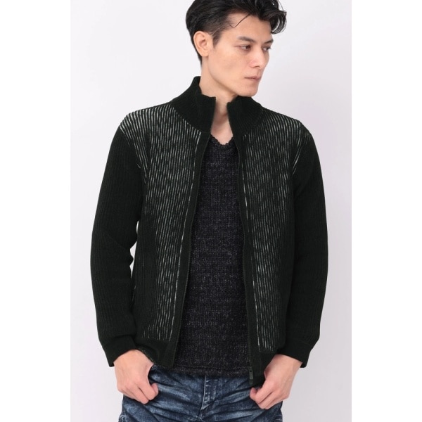 モールヤーンとかすり糸を組み合わせた変わり編みのスタンドZIPニット。身頃は、モールタックストライプとカスリ糸を組み合わせ、奥行きのあるメランジ見えの編地となっています。