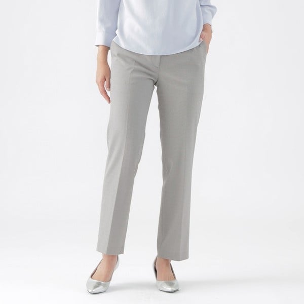 SANYO PANTS LAB.プロジェクトチームにより、3D CADを駆使して着用時の負荷や圧力を細かく分析し、見た目がきれいでお腹まわりのキツさを感じにくい快適な穿き心地のパンツを開発しました。また、仕様面にもこだわり、フロントの袋布はお腹をカバーしつつすっきりみせます。ウエスト部分はストレッチ性のある芯を使い体になじみつつ伸縮性についていきますので、いつでもすっきりきれいに見えます。後ろウエスト部分にゴムが入っているパンツと比べて、とてもヒップの形状がきれいに見える仕様になっています。同素材テーラードジャケット(U1E01509)ノーカラージャケット(U1E03509)とのセットアップがおすすめです。