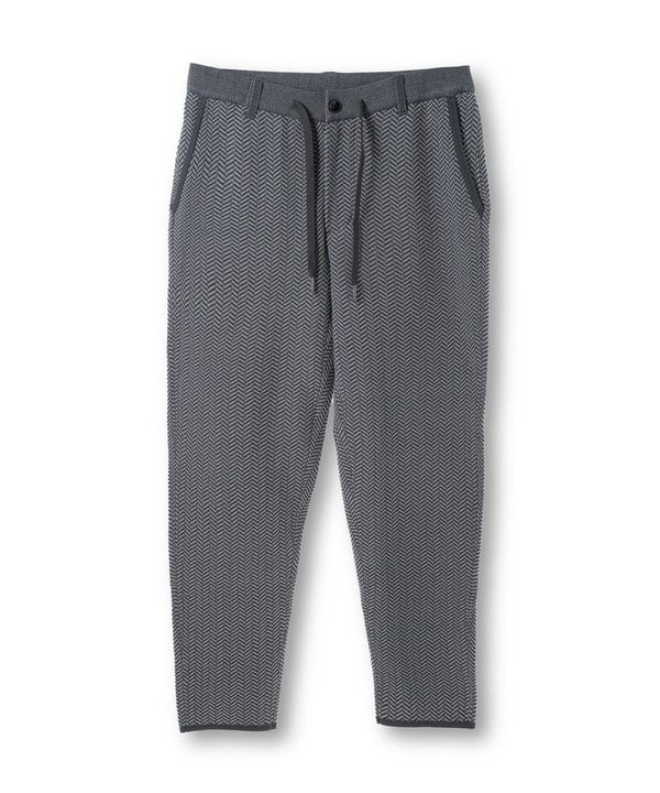 英国調のヘリンボーン柄のポリエステル素材を使用したきれい目のニットパンツです。