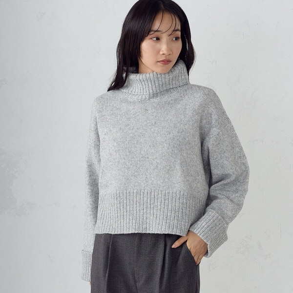 首もとがポイントになるオフタートルネックは顔周りが華やかな印象になり