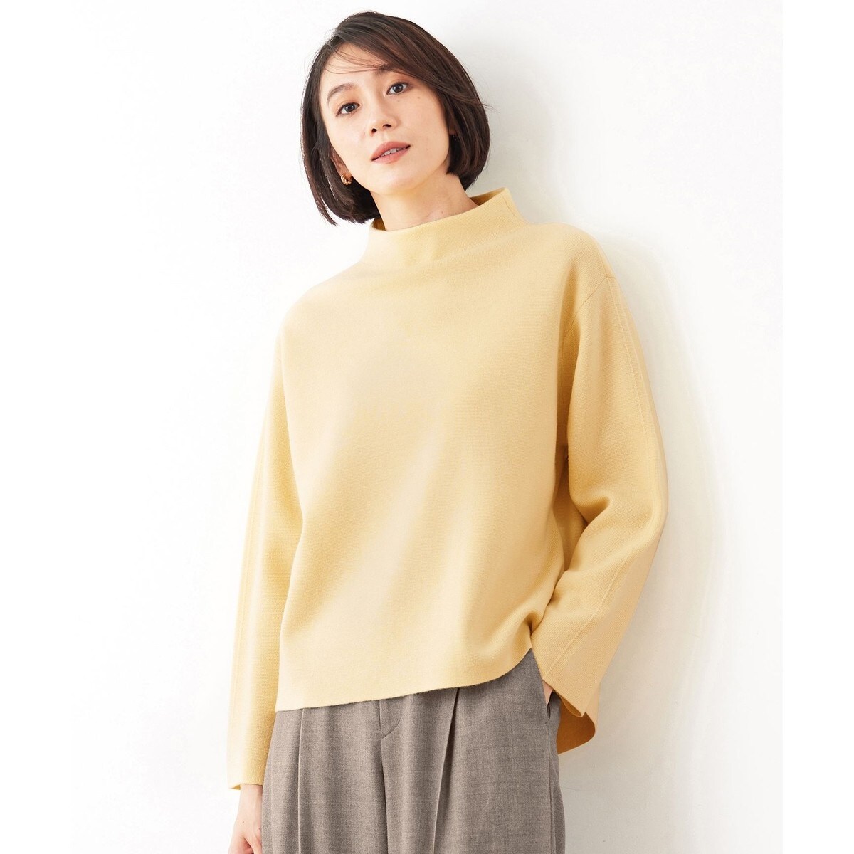 ボトムを選ばず合わせやすいボトルネックニット■デザイン上品ですっきりとした印象のボトルネックや、バックスリットがポイントのニットです。クリーム(040)カラー以外の3色は、前後に繊細な配色を施しています。体のラインを拾いにくい程よくゆとりのあるシルエットで、ボトムを選ばず合わせやすいデザインです。同素材のスカート(SKWMCW0556)とセットアップでの着用もおすすめです。■素材しなやかなウールと、糸に撚り戻しをかけ膨らみと軽さが特徴のバルキーアクリルをブレンドした糸で、適度にハリとコシのある中肉のミラノリブを作りました。コンパクトですっきりとした肌触りです。■同素材アイテムベスト(KRWMCW0557)スカート(SKWMCW0556)ボーダーニット(KRWMCW0562)