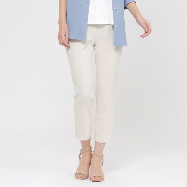定番のクロップド丈パンツ。素材のストレッチ性とウエストゴム仕様がストレスフリーな履き心地。そして身頃の切り替えによる立体感と裾のスリットがスッキリとしたシルエットを形成します。