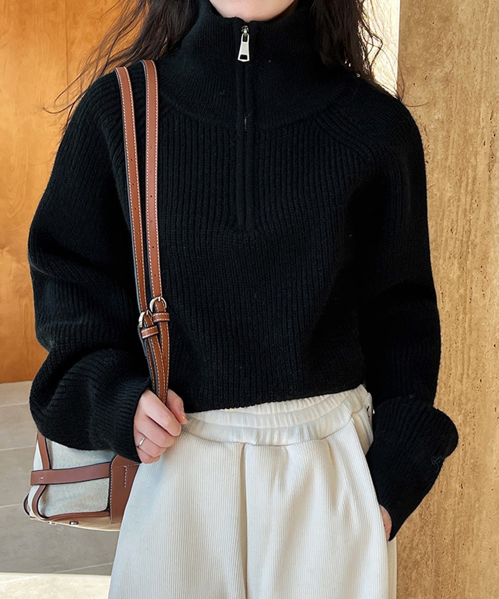 ハイネック仕様で首元まで暖かさをキープするショート丈のニットトップスです。