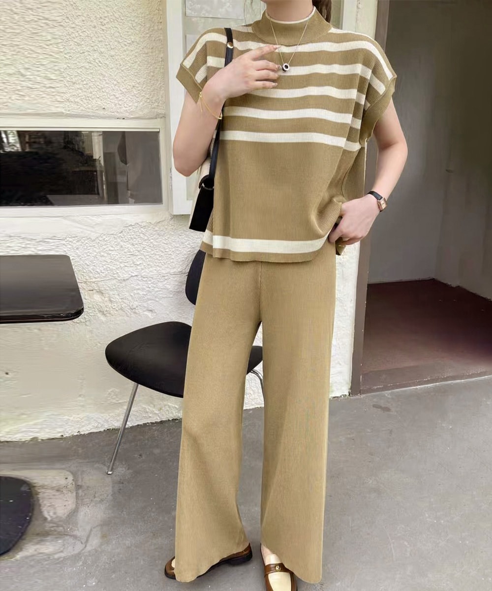 ボーダーフレンチ袖トップス×ワイドパンツのレディースニットセットアップ