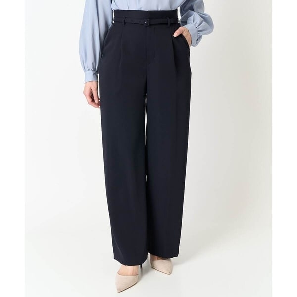 すっきりとしたワイドシルエットのパンツ。ウエストには共地のベルトが付いているのでコーディネートのアクセントに。後ろウエストはゴム入りでストレスフリーな着心地も嬉しい。