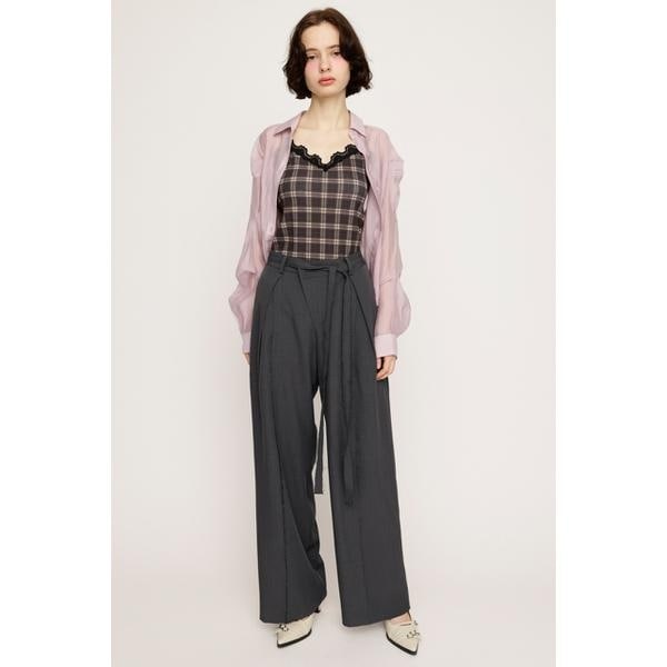 【CENTER TAPE TUCKED TROUSERS】■POINT:センターシームデザインがポイントのリラックス感のあるはき心地のトラウザー。■DETAIL:フロントの重なりディテールとあえて表に出した断ち切りシームデザインが着用するだけでポイントに。程よい太さのストレートシルエットで後ウエストはゴム仕様になっているので、ストレスフリーでデイリー使いしやすいアイテムとなっています。■STYLING:一枚で様になるパンツなので、シンプルなトップスをインしたり、クロップ丈のシャツですっきりと見えるスタイリングがおすすめです。カジュアルから綺麗めまで様々なスタイリングを楽しんで頂けます。■FABRIC/MATERIAL:シワになりにくいポリエステル素材を使用しています。※本品は素材の特性上色落ちします。洗濯、クリーニング、着用(使用)時に他の衣類や雑貨、家具類に色移りする事があります。特に汗や雨等で湿った状態では、色落ちが顕著になります。白、淡色との組み合わせは避け、お取り扱いには十分ご注意下さい。本品は裁ち切り始末にしています。着用や洗濯、クリーニングの繰り返しにより、ほつれが増したり、裁ち切り部分が丸まってくる事がありますので、ご了承下さい。ほつれが目立った際はほつれた糸を引っ張ったりせず、カットして下さい。[注意事項]※画像の商品はサンプルです。実際の商品と仕様、加工が若干異なる場合があります。※画像の商品は光の照射や角度、お使いのモニター環境により、実物と色味が異なる場合がございます。※着用、お取り扱いの際は、アテンションタグをご確認ください。※一部予約商品につきましては生産上の都合によりお届け予定日や店頭発売と前後する場合もございます。※追加生産商品は、一部の店舗、通販で販売中の場合がございます。予めご了承下さい。