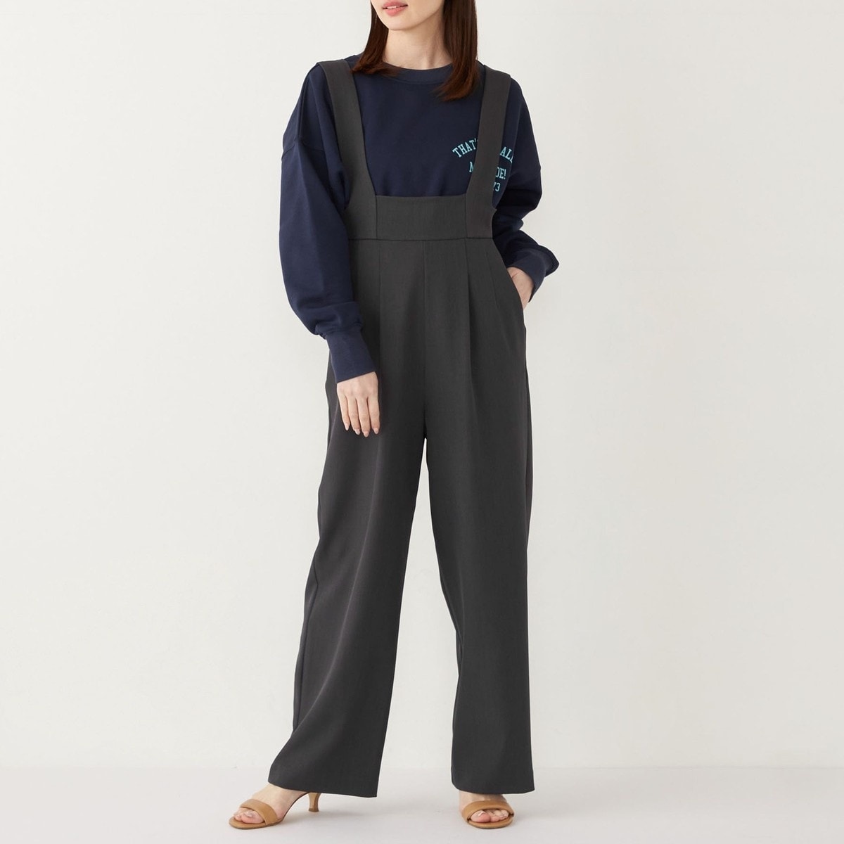 ハイウエストデザインが特徴のサロペット。