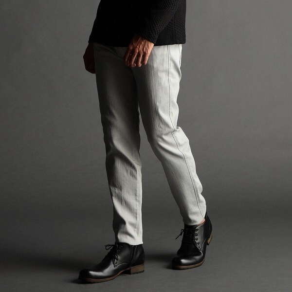 ウエストと腰周りは少しタイトめ調整し、裾口にかけて細くしたスキニーシルエットの細身の綺麗なラインです。股下はフルレングスなので裾上げして調整してくだ