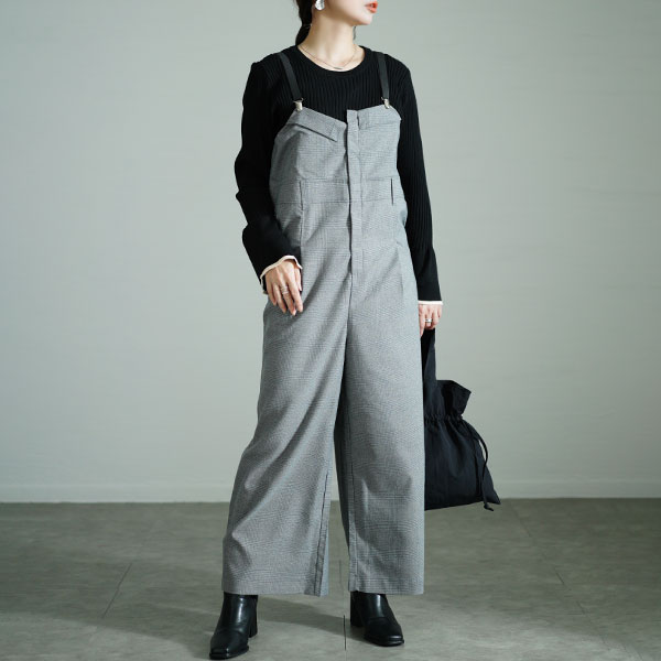 さり気ないアシンメトリーが効くサスペンダー付きサロペットパンツは、スタイリッシュさを演出するグレーのグレンチェック柄が知的な大人っぽさを体現。遊び心感じるアシンメトリーでこなれたモード感を重ね、ハイウエスト風デザインで脚長効果を引き立ててくれる一枚。ゆったりワイドパンツでハンサムに体型カバーし、トレンドスタイルに仕上げます。サスペンダーは取り外し可能。フロントのファスナーで簡単に着脱でき、通年楽しめるサロペットパンツです。