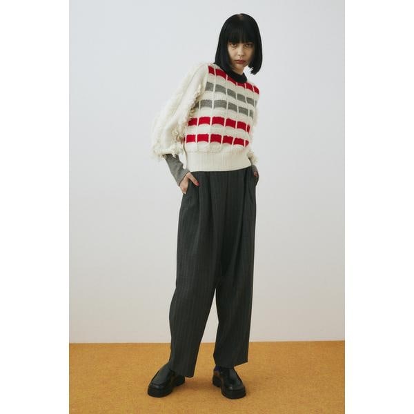 ややコクーンのようなラインをしたルーズパンツ。ピンストライプの生地を使用しているため、1枚でポイントになるパンツに。タックが入っているため、ラインも綺麗に見せてくれます。やや起毛感があるため、温かみのある見え方も嬉しいポイント。レーヨンとポリウレタンを加えることで、ストレッチ性と上品なしなやかさを表現したウール調合繊素材を使用しています。2タックルーズパンツ