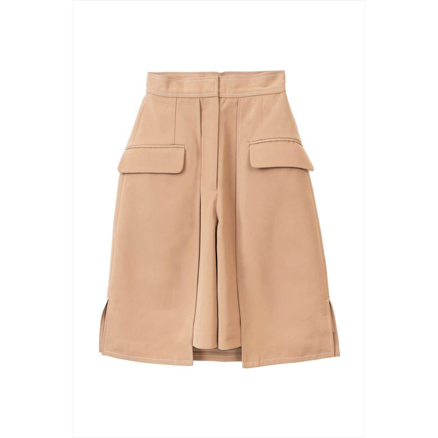 ショートパンツにタイトスカートの印象を与えたレイヤードデザイン。高級スーツに使われる綾目の素材を使用し、飾りステッチで仕上げ。膝をすっきり魅せる長めの丈感が上品で落ち着いた印象でシーンを選ばず楽しんでいただける。