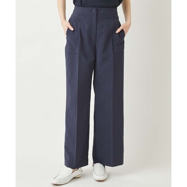 ドライタッチのカジュアル素材で仕立てたきれいなラインのワイドパンツ