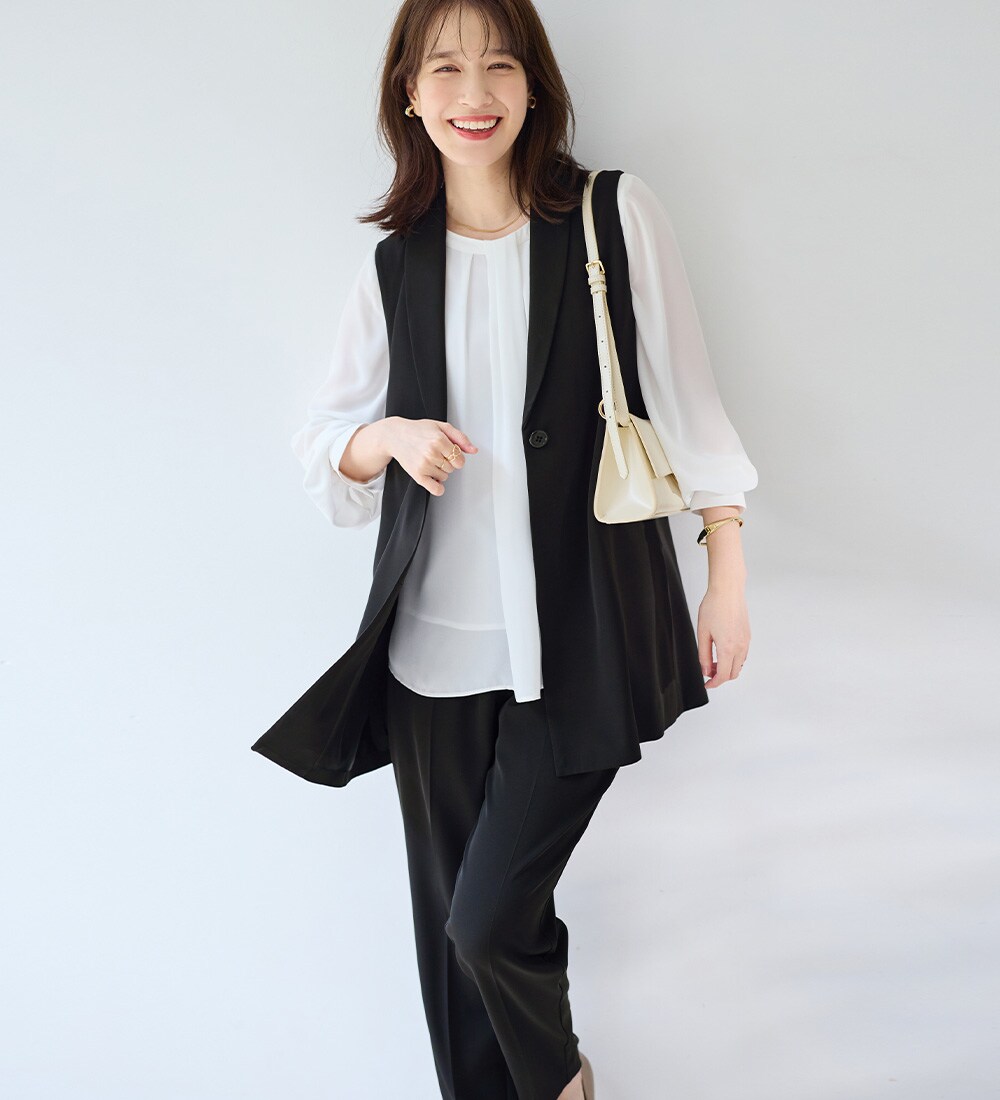 ・簡単に、お洒落見え&キチンと見える、ロングジレ・ブラウス・パンツの3点セットアイテム。
