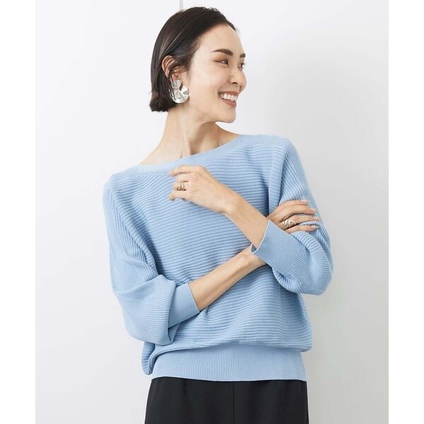 リブの横使いのボートネックのドルマンスリーブプルオーバー。袖口と裾のリブで着るだけでシルエットがサマになるデザインです。アウターのインナーとして着ても袖が上がりにくいデザインでご用意いたしました。2023年秋に初登場で好評だった長袖タイプを、2024年の新色でご用意いたしました。40サイズは限定店舗展開です。