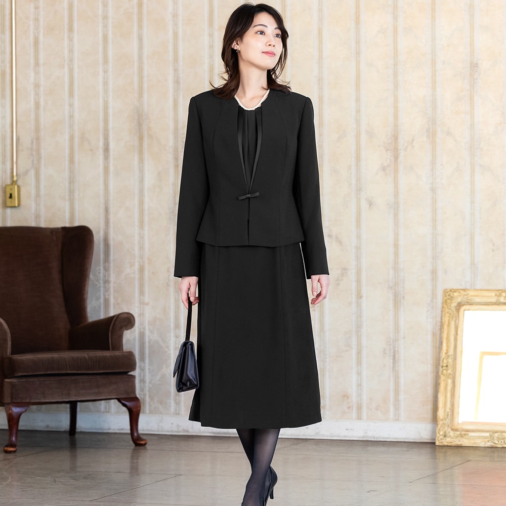 ブラックフォーマル専用の漆黒の生地がマナーに沿った装いでありながら、