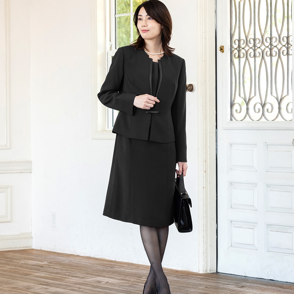 ブラックフォーマル専用の漆黒の生地がマナーに沿った装いでありながら、
